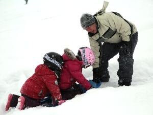A man tries to pull his two children and the sled up the hill at Riverdale Park East in Toronto, Ont., on Sunday. (Elaine Wong/CBC)
